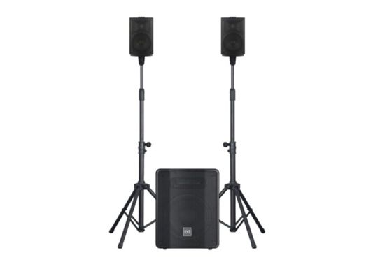 Система состоит из сабвуфера со встроенным микшерным пультом и двух пассивных акустических систем. Решение для небольших выездных мероприятий и закрытых помещений площадью до 60 кв.метров. Система оснащена 8-канальным микшером-усилителем с встроенным эквалайзером, EFX, Bluetooth, модулем цифрового усилителя класса D. Общая выходная мощность 370 Вт (RMS). Корпус выполнен из пластика и может быть установлен как на пол, так и в подвес. В комплекте две акустические стойки и чехол.